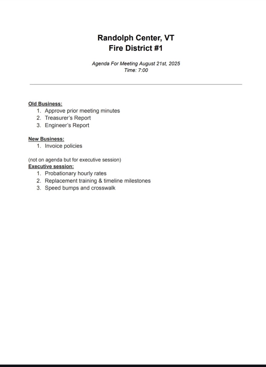 At the RFD#1 Annual Meeting on May 21, 2024 it was decided that future Prudential Committee meetings will be held quarterly (rather than monthly) unless urgent business required greater frequency.